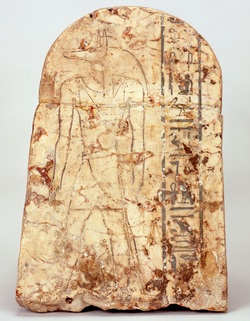 イビは、紀元前7世紀、古代エジプトの第26王朝の時代の人だそうです。上エジプト全土の監督官が具体的にどのような仕事であったのかはよく解りません。一説には、カルナックのアメン大神殿の財宝を監督する役人だったとも言われており、かなりの有力者だったようです。テーベ西岸のアサシーフ地区にある、王でない者としては非常に立派なお墓に入っていたそうで、イタリアのトリノ博物館には、重厚で見事な造りのこの人の人型石棺の蓋があります。この石棺の蓋の銘文の中にも、この石板と同じような記述があるそうですから、お棺の主と石板に書かれている人物が同一人物であることは、まず間違いないようです。でも、この石板がこのお墓から出たのか、或いは別の場所から出土したのか、はっきりした記録がありません。石板に書かれている内容は、死者の最も簡単な記録ですし、アヌビス神が描かれていますから、何らかの形でお墓に関係があったことは推測されますが、それ以上のことは解りません。イビのお墓の前か、お参り用の場所に、標札か案内板のように、この石が建てられていたように感じますが、これも声の正しくない私の勝手な妄想にすぎません。
