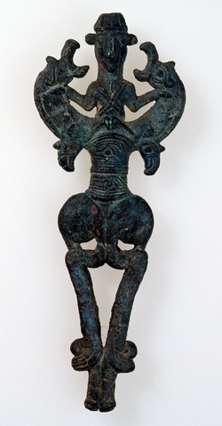 神獣飾付祭具と呼ばれている理由は、今展示されている物を見てもお解りいただけるとおり、中央に神様が立っており、その両脇に怪獣が配置されていることに由来します。今回の作品では、中央の神様が左右の怪獣をそれぞれ片手で締め上げているという形が左右対称の構図で作られています。裏側にも、同じ図柄が彫られています。前から見ても後ろから見ても同じ印象を与えたいと考えて作られたということなのでしょうか。ペルシア・ルリスタン地方からは、この他にも同じような青銅製の神像類がよく出土するようで、いずれも紀元前8世紀から7世紀ころの作品と推定されています。